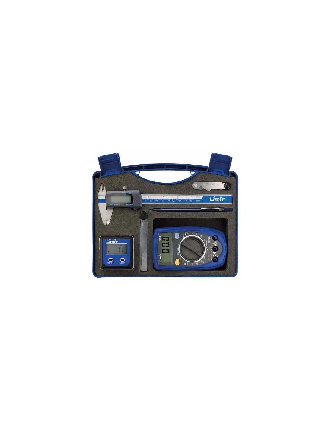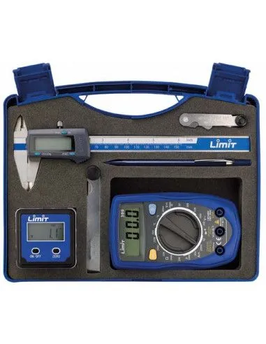 El Kit de Medición 6 piezas de Limit está formado por un calibre digital de 150mm, un multímetro Limit 300, un nivel digital un transportador, una galga de roscas, una galga de espesores y una punta de trazar.