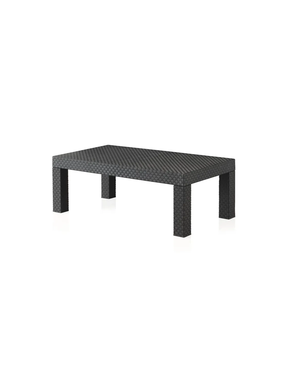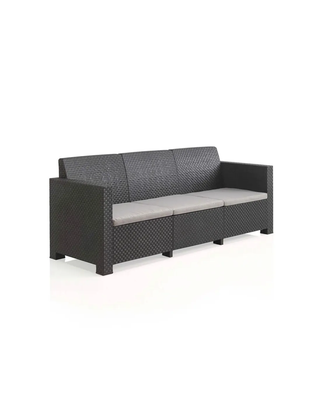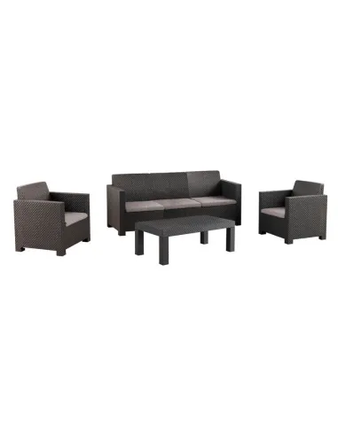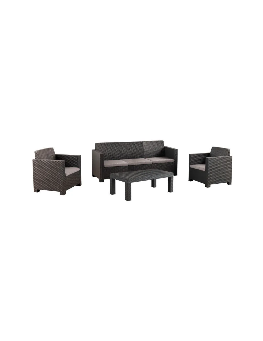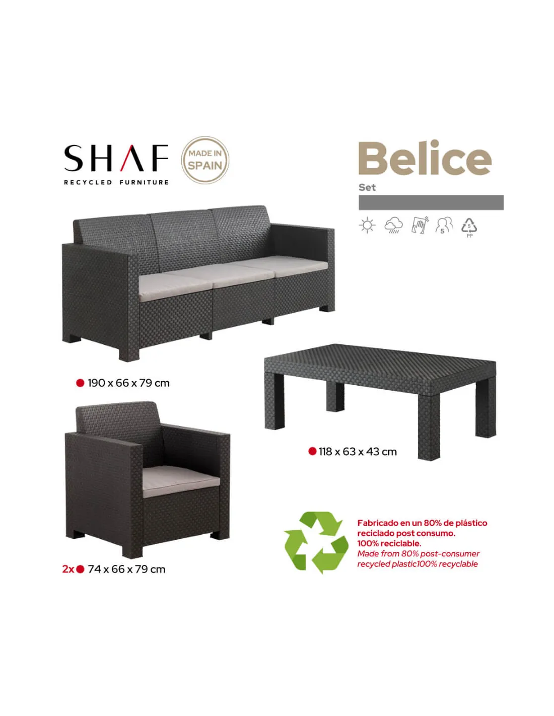 Está fabricado utilizando plástico reciclado post-consumo proveniente de nuestra propia planta de reciclaje y no incluye componentes metálicos para facilitar su posterior reciclado, en un elegante color grafito con una textura que imita el trenzado de ratán, este set para 5 personas incluye un sofá de 3 plazas, dos sillones individuales, cojines de asiento y una mesa baja de centro.