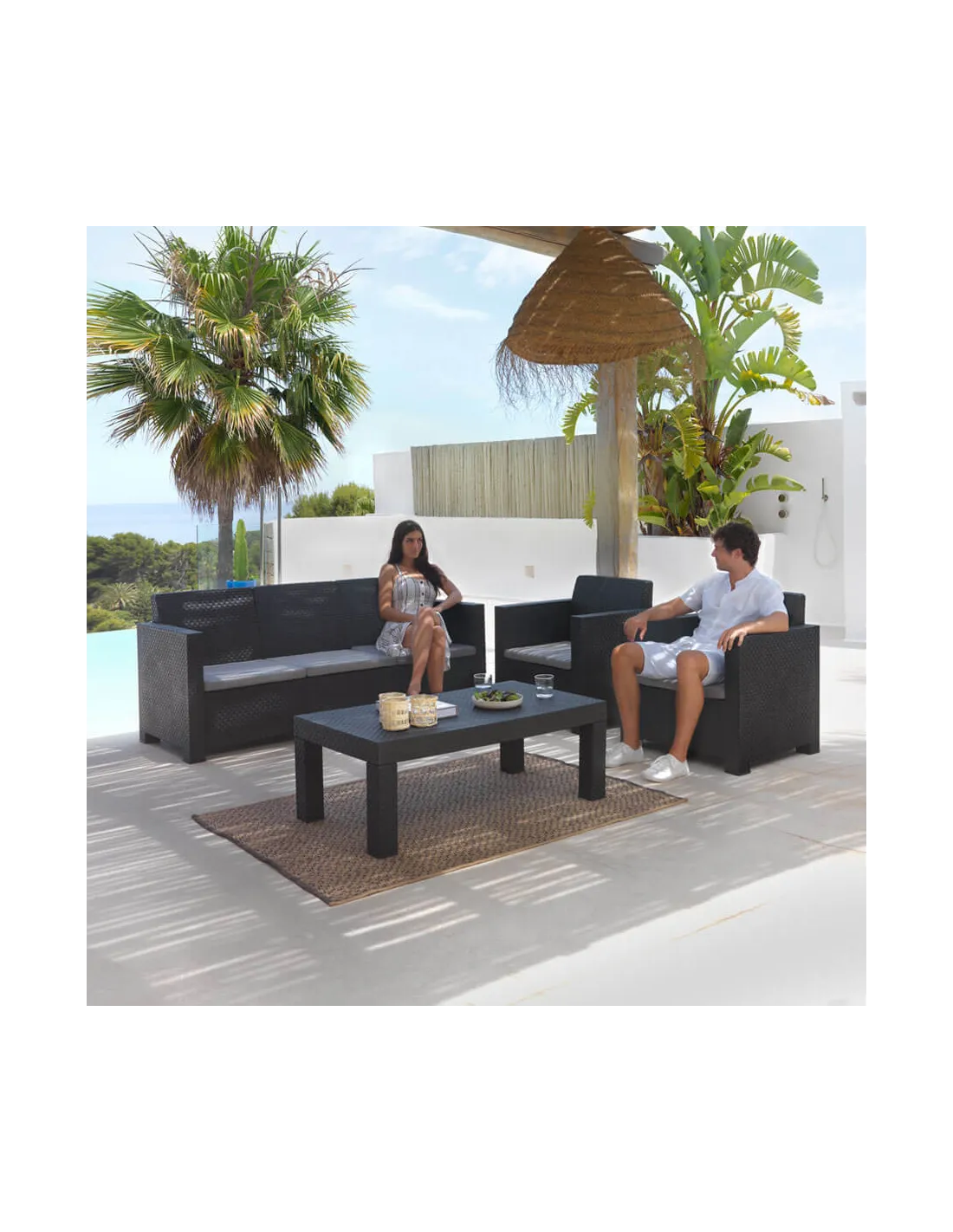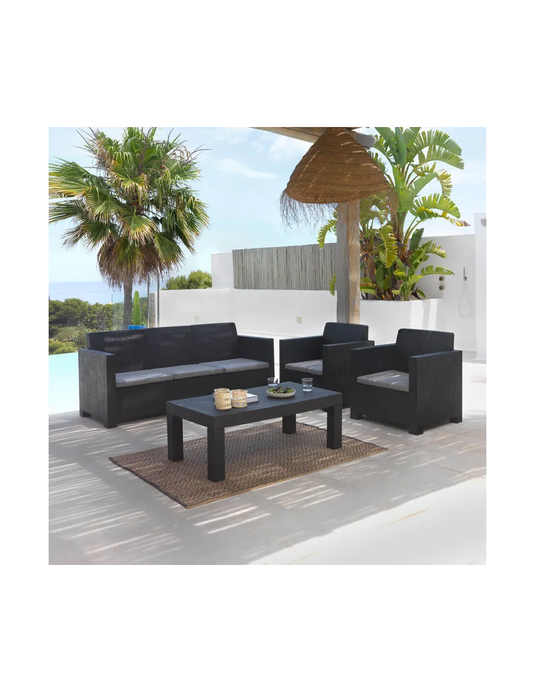 El conjunto de jardín Belice es la solución perfecta para transformar cualquier espacio al aire libre en un oasis de comodidad y elegancia. Su diseño de líneas suaves y su elegante color grafito lo convierten en el complemento ideal tanto para interiores como para cualquier terraza, balcón o jardín.
