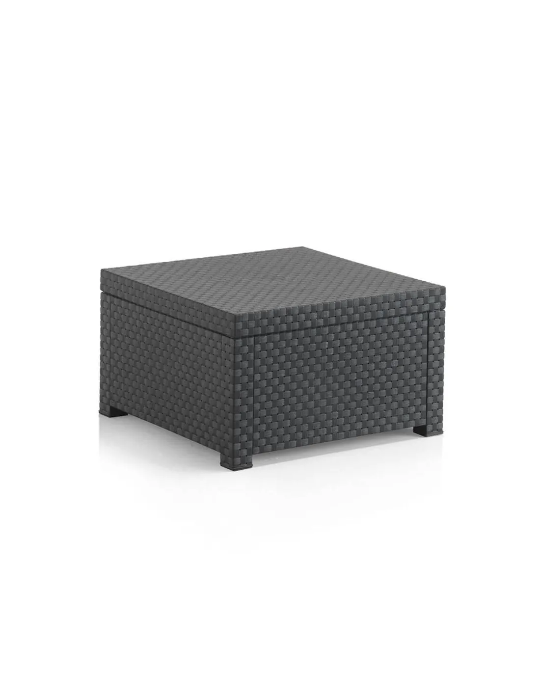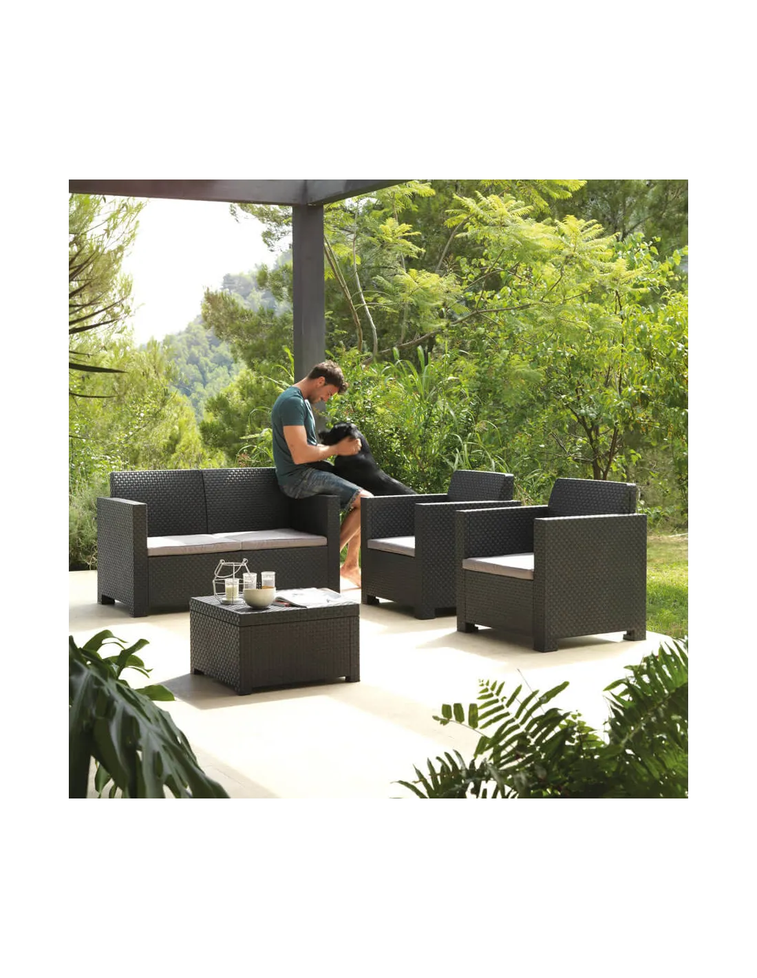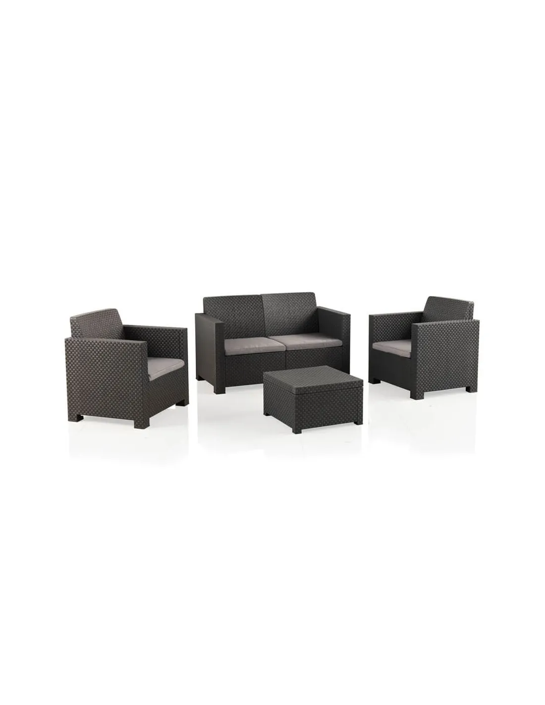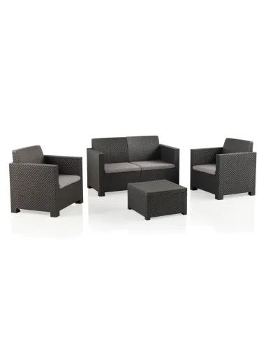 Está fabricado utilizando plástico reciclado post-consumo proveniente de nuestra propia planta de reciclaje y no incluye componentes metálicos para facilitar su posterior reciclado, en un elegante color grafito con una textura que imita el trenzado de ratán, este set para 4 personas incluye un sofá de 2 plazas, dos sillones individuales, cojines de asiento y una mesa baja de centro.