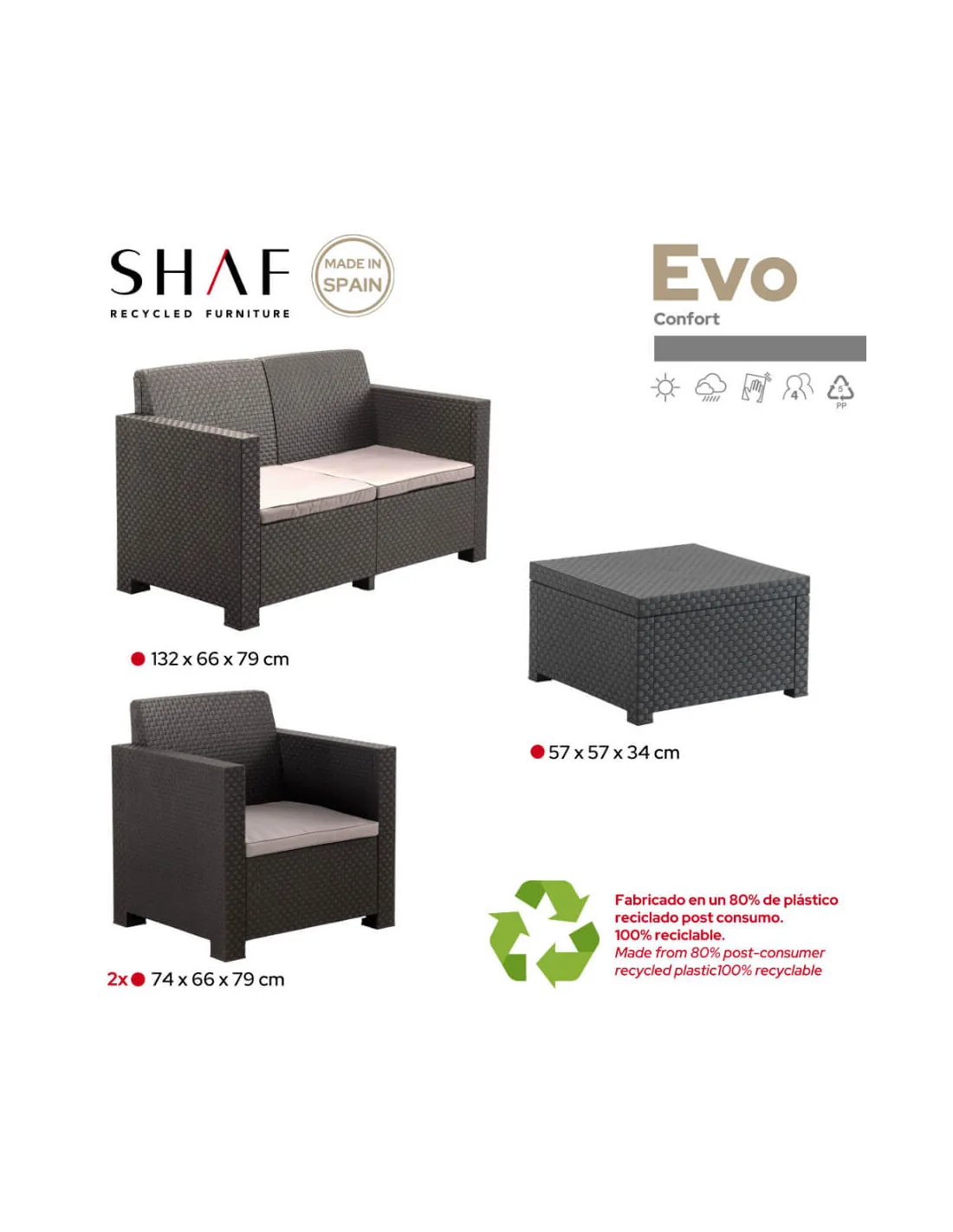 El conjunto de jardín Evo Confort es la solución perfecta para transformar cualquier espacio al aire libre en un oasis de comodidad y elegancia. Su diseño de líneas suaves y su elegante color grafito lo convierten en el complemento ideal tanto para interiores como para cualquier terraza, balcón o jardín.