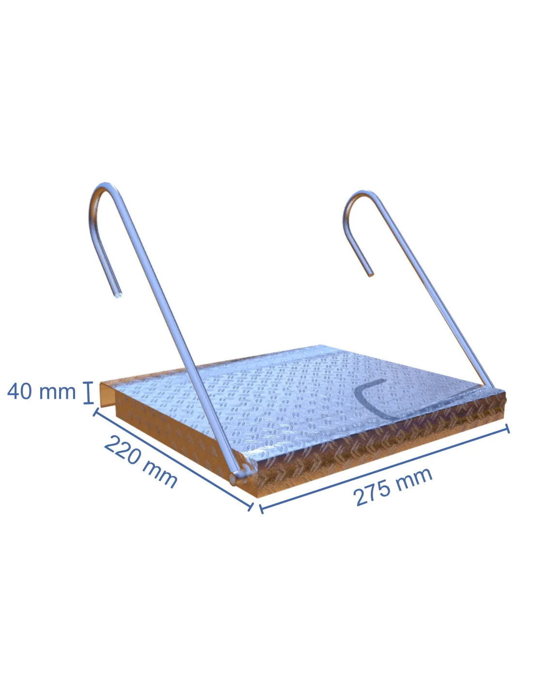 Dimensiones de la plataforma 275mm x 220mm. Es la dimensión del ancho mas grande que se le puede dar para que entre en cualquier escalera.