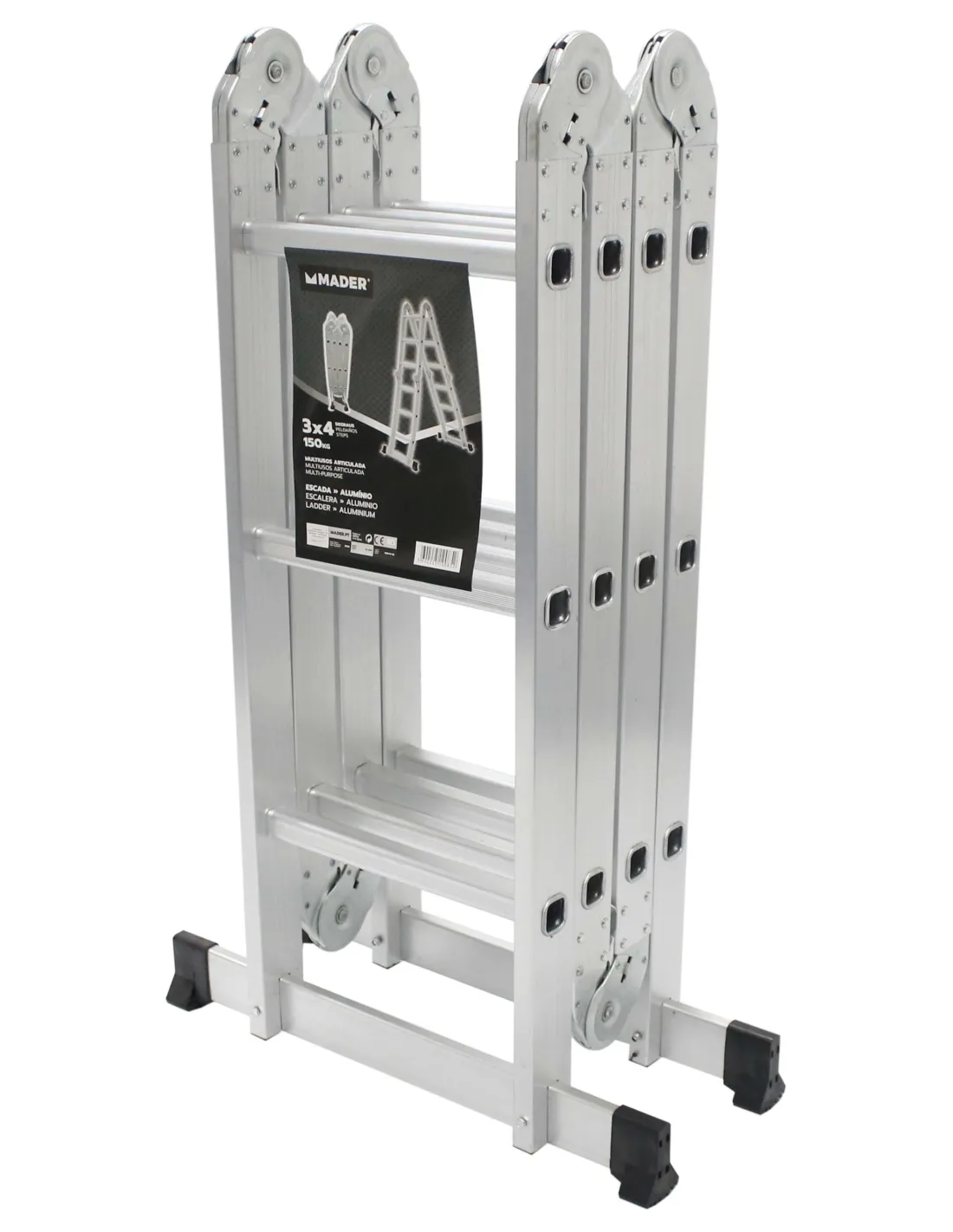 3 escaleras en 1, ya que trabaja en 3 posiciones: extensible, tijera y como plataforma (no incluye plataforma) ó andamio. Una vez plegada ocupa muy poco espacio, lo que facilita sutransporte y almacenaje.