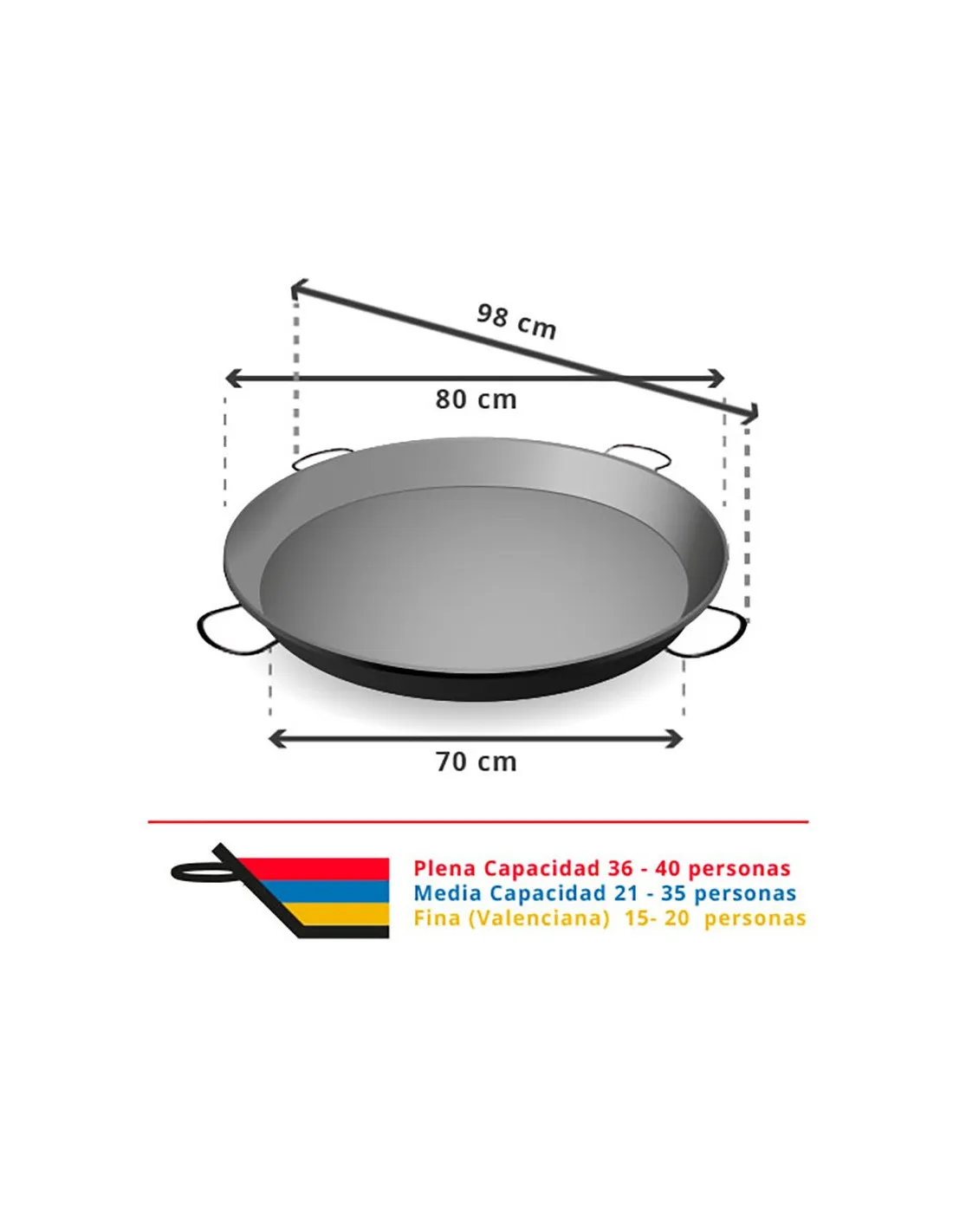La paella, según la altura del arroz utilizado en su preparación, tienen una capacidad diferente, puedes consultar la segunda foto de nuestros productos para ver su capacidad, según la altura de la capa de arroz y las medidas de sus diámetros. La paella al estilo valenciano se caracteriza por tener una capa fina de arroz, pero podemos aprovechar la altura de la paella para cocinar un número mayor de raciones.
