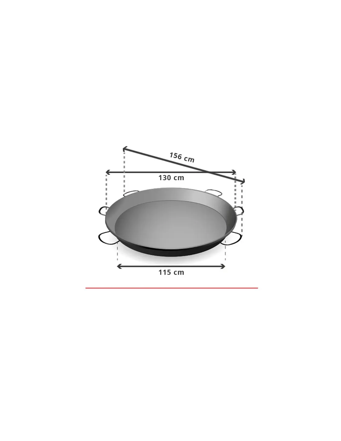Esta paella de acero pulido de 130 cm es adecuada para servir 100-200 raciones completas.