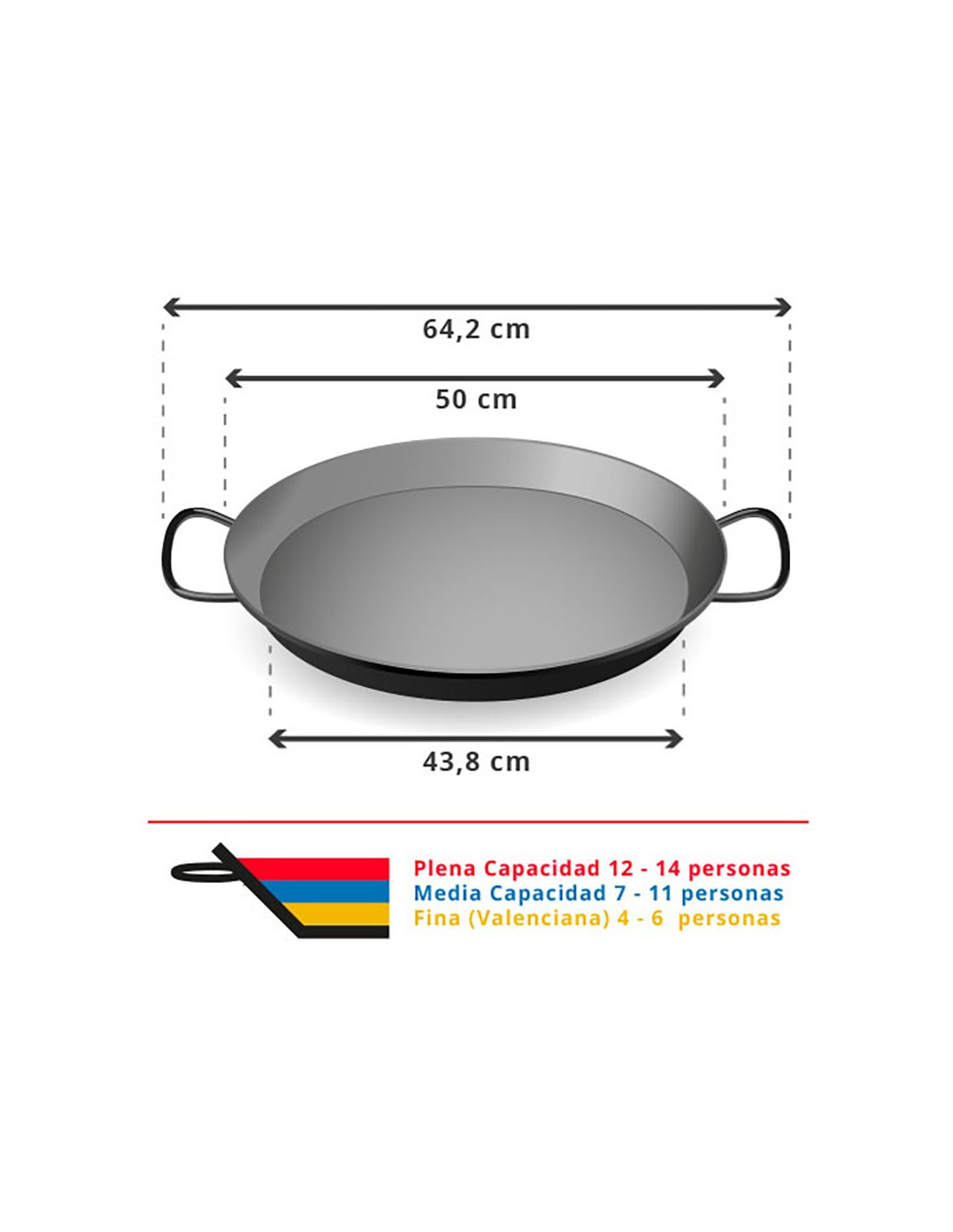La paella, según la altura del arroz utilizado en su preparación, tienen una capacidad diferente, puedes consultar la segunda foto de nuestros productos para ver su capacidad, según la altura de la capa de arroz y las medidas de sus diámetros. La paella al estilo valenciano se caracteriza por tener una capa fina de arroz, pero podemos aprovechar la altura de la paella para cocinar un número mayor de raciones.