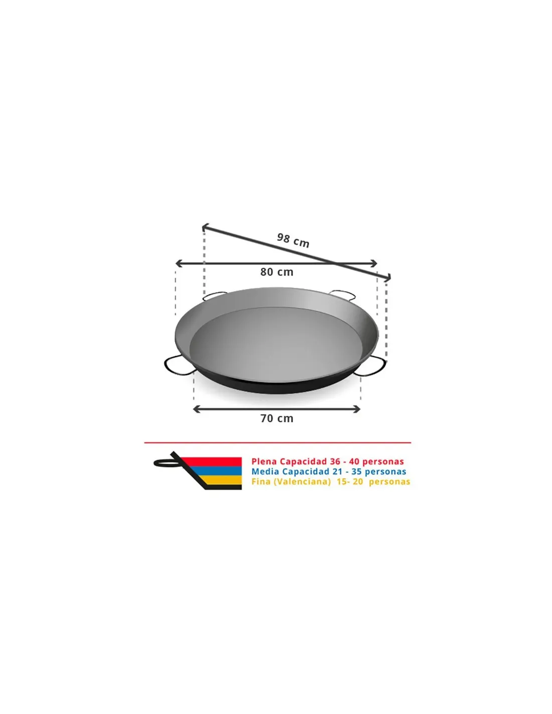 La paella, según la altura del arroz utilizado en su preparación, tienen una capacidad diferente, puedes consultar la segunda foto de nuestros productos para ver su capacidad, según la altura de la capa de arroz y las medidas de sus diámetros. La paella al estilo valenciano se caracteriza por tener una capa fina de arroz, pero podemos aprovechar la altura de la paella para cocinar un número mayor de raciones.