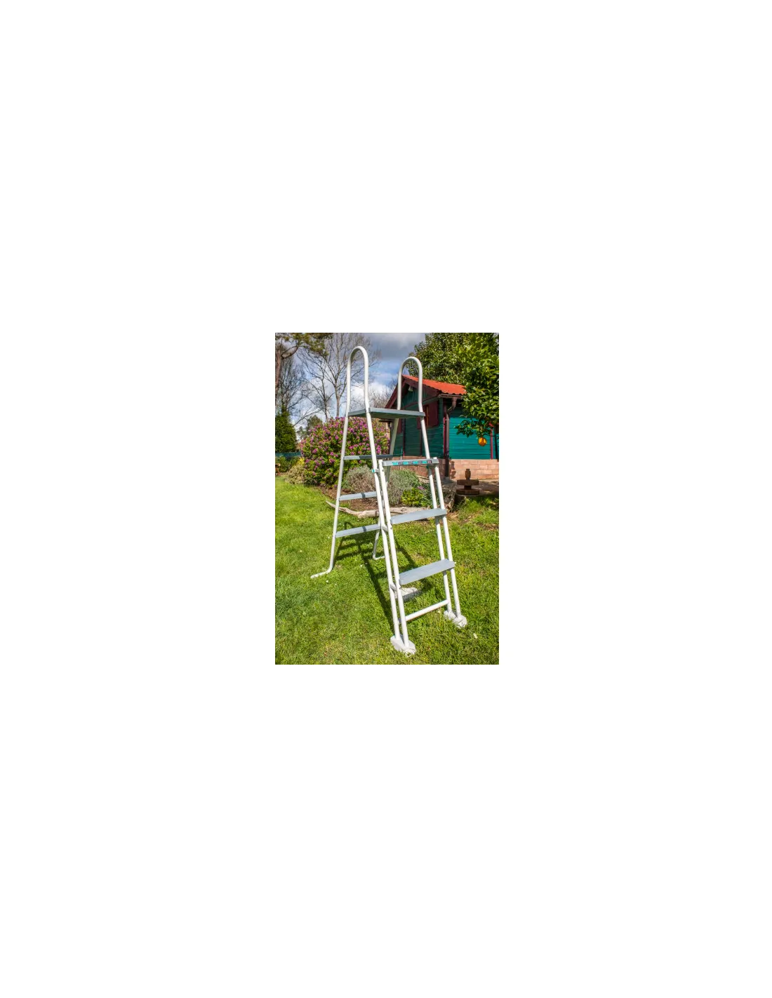 - Escalera de seguridad tipo tijera 2x3 peldaños. Permite desmontar los peldaños de un lado para impedir el acceso de los niños a la piscina y prevenir accidentes. Conforme a la norma Europea