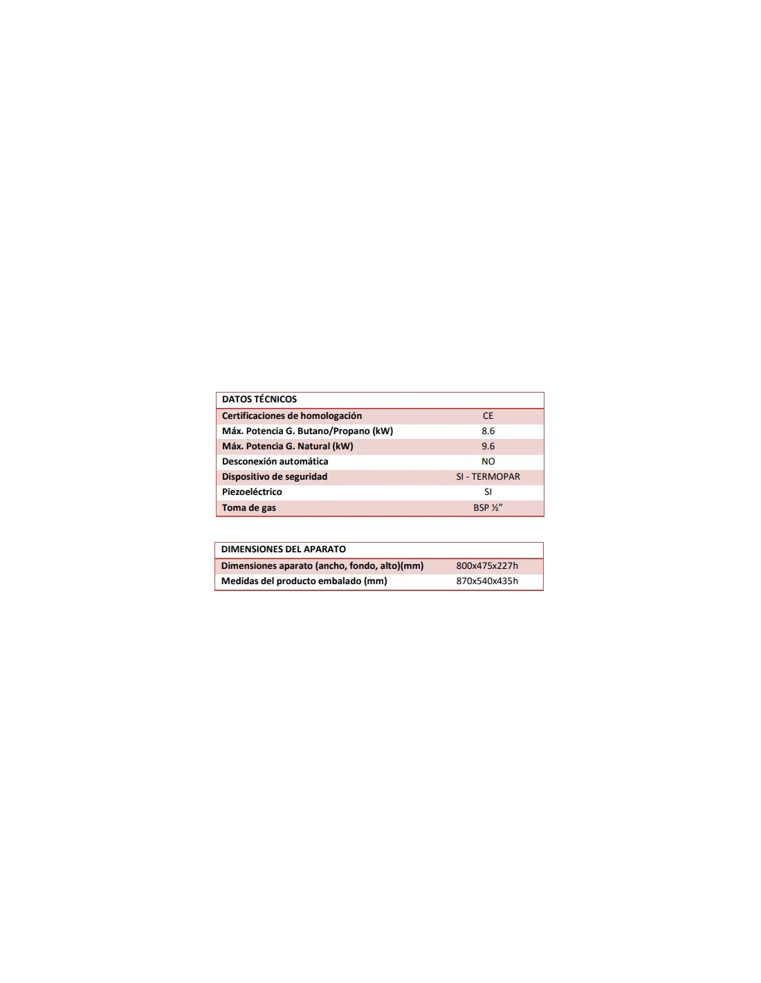 *Se suministra con inyectores para gas propano/butano. También se incluyen los inyectores para cambio a gas natural.