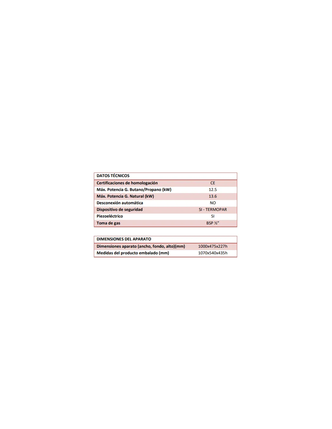 *Se suministra con inyectores para gas propano/butano. También se incluyen los inyectores para cambio a gas natural.