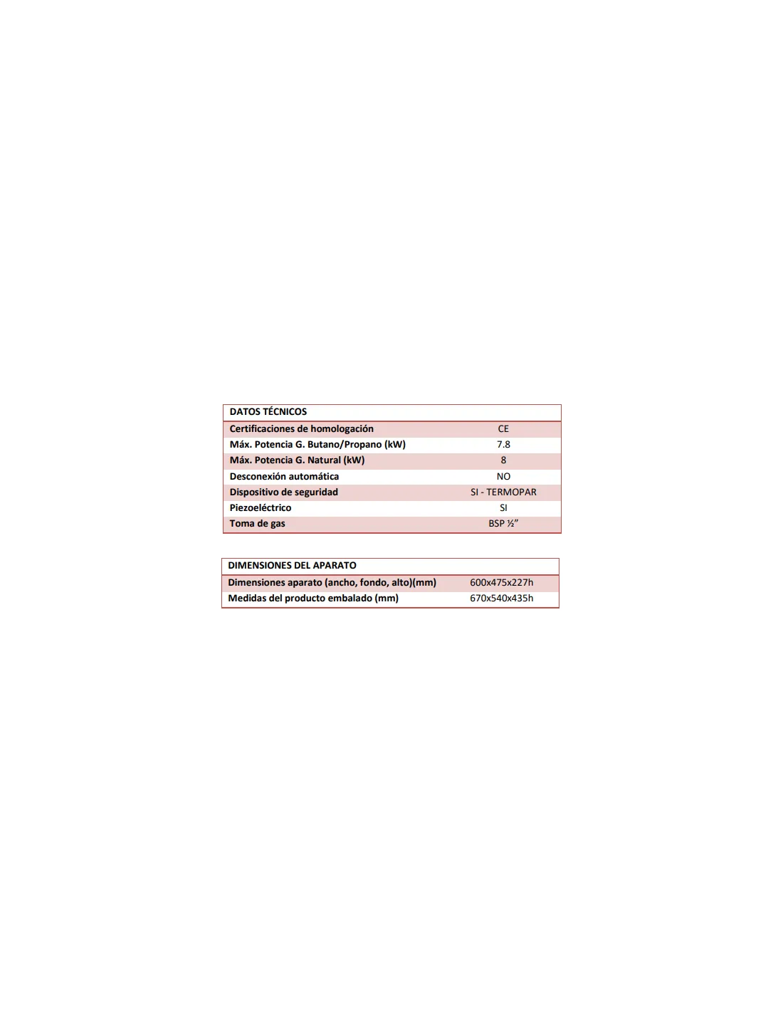 *Se suministra con inyectores para gas propano/butano. También se incluyen los inyectores para cambio a gas natural.