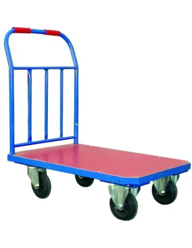 Plataforma fabricada en Tubo de acero soldado con medidas de 910x610. Superficie de fibra de madera roja. Dos Ruedas fijas y dos giratorias de goma maciza. Capacidad de carga hasta 500 Kg.