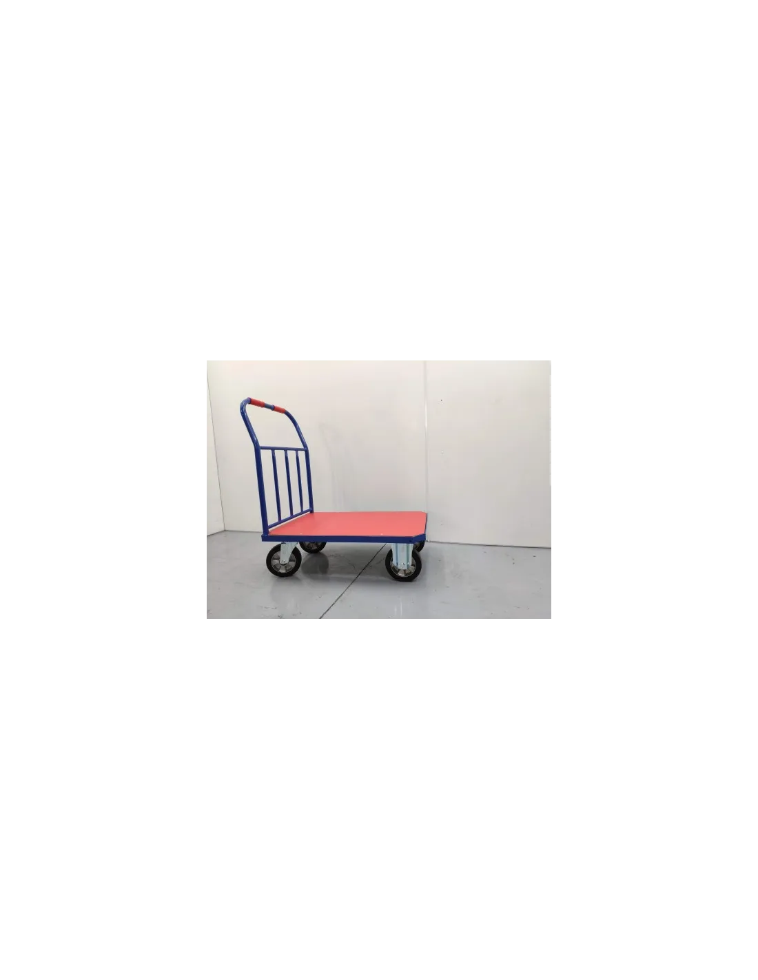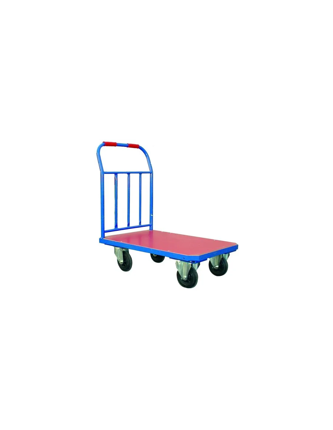 Plataforma fabricada en Tubo de acero soldado con medidas de 910x610. Superficie de fibra de madera roja. Dos Ruedas fijas y dos giratorias de goma maciza. Capacidad de carga hasta 500 Kg.