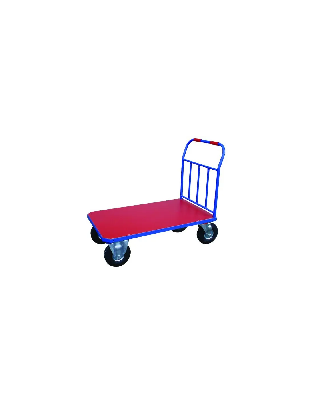 Superficie de fibra de madera roja, dos ruedas fijas y dos giratorias neumáticas, que permiten una movilidad total del carro.