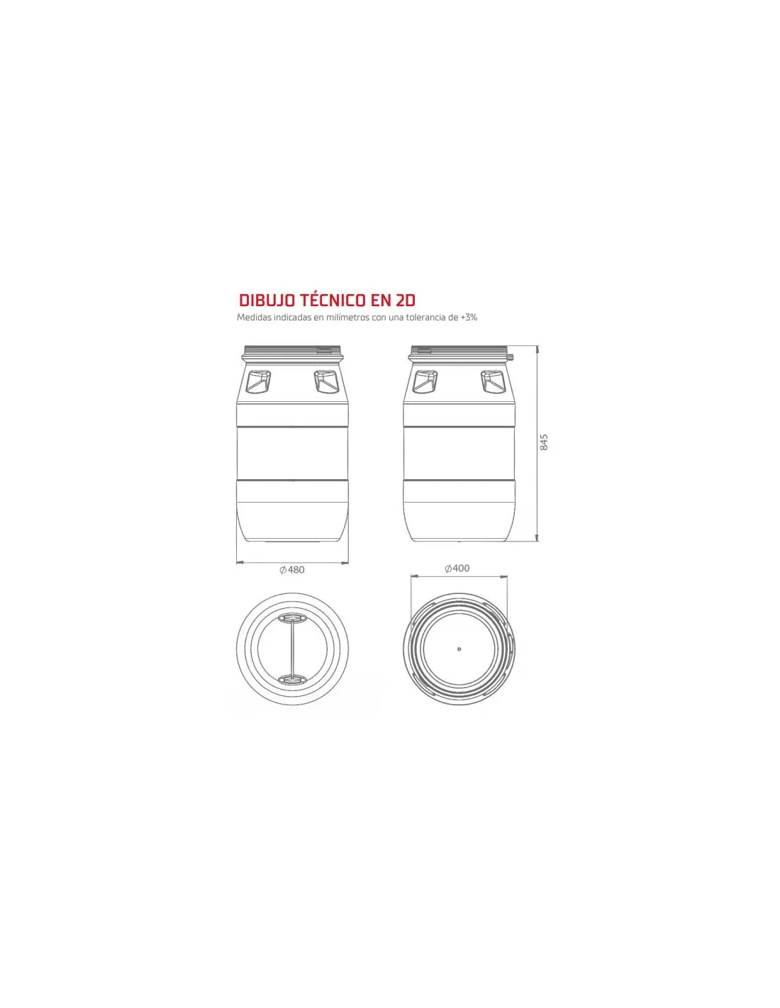 - Sistema de cierre: Tapa de Ø 400 mm con anillo metálico de cierre con sellante EPDM.