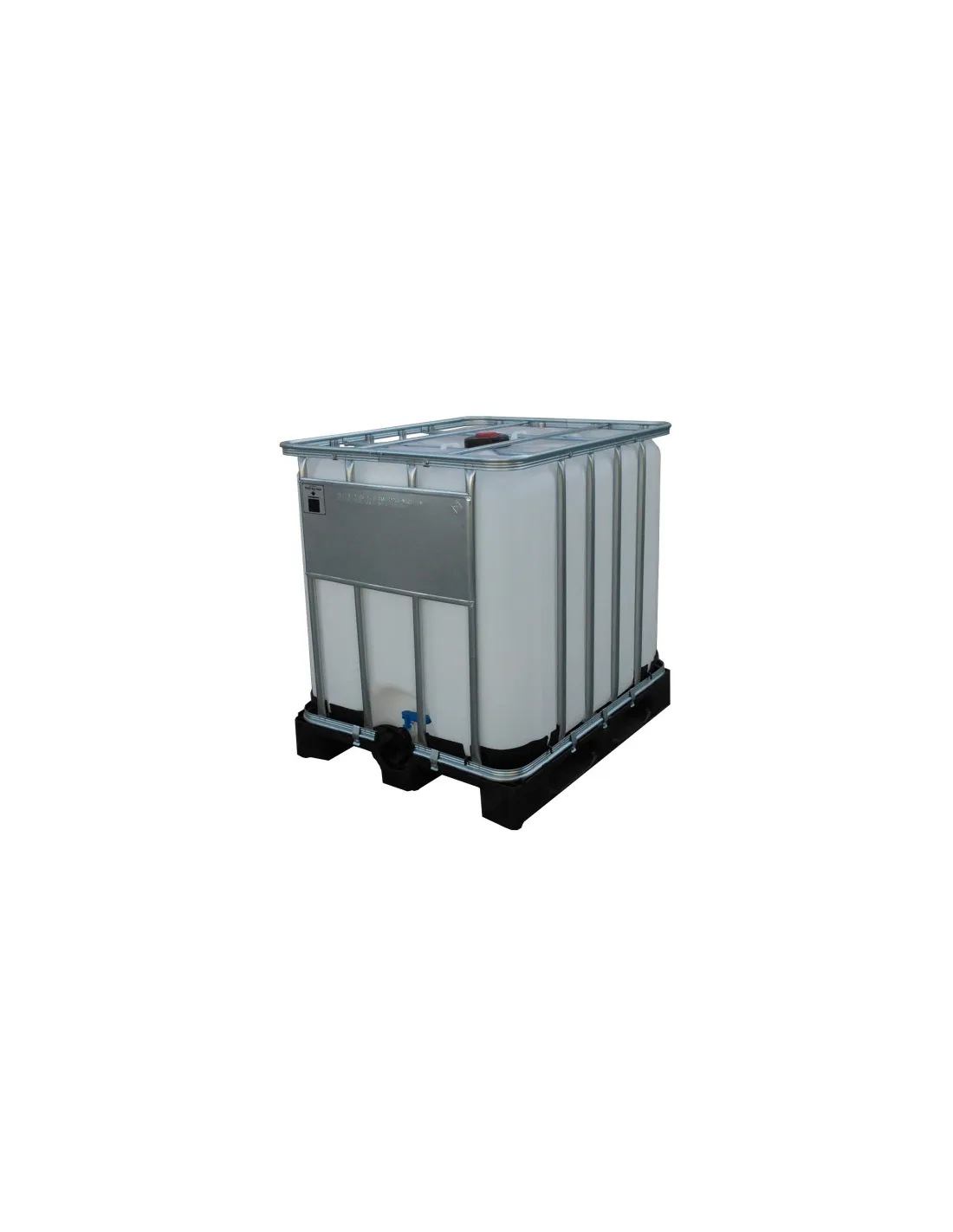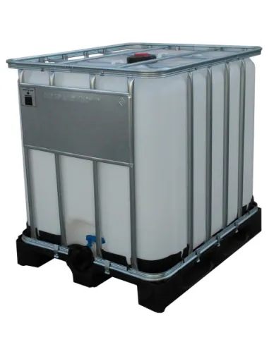 Depósito o contenedor de 1.000 litros fabricado en polietileno de alta densidad y alto peso molecular (PEAD-APM), con estabilizante UV. Jaula de perfil cuadrado de acero galvanizado construida por electrosoldadura automática.