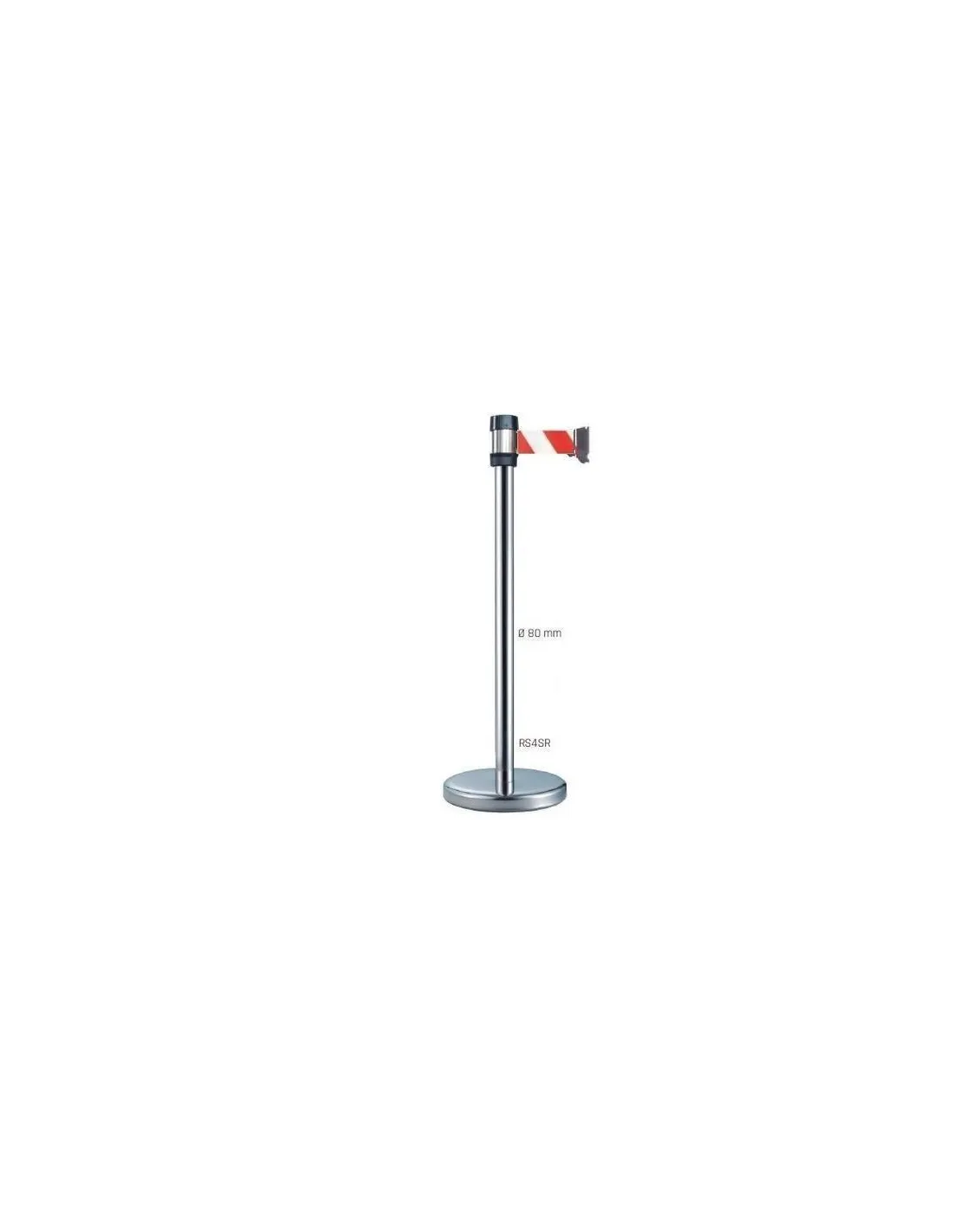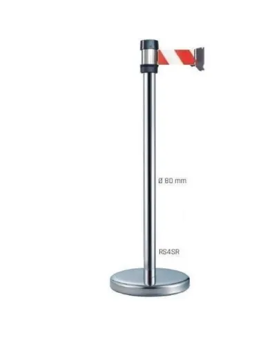 El Poste de Señalización Separador modelo RS4SRRB de MetalWorks dispone de cinta retráctil que puede extenderse hasta los 4,10 metros de longitud y una tapa cubierta de acero. Dispone de una base de 360 mm y puede incorporar una única cinta. También pueden añadirse accesorios en la parte superior como un Display A4 Rotatorio.