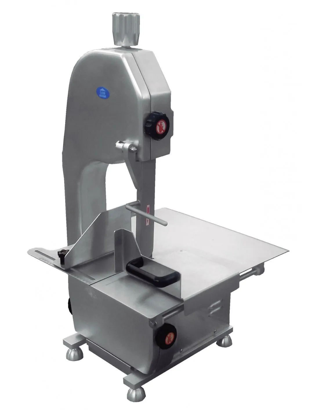 Sierra de gran potencia con estructura de aluminio anodizado y superficie de trabajo en acero inoxidable para alimentos con huesos o congelados.