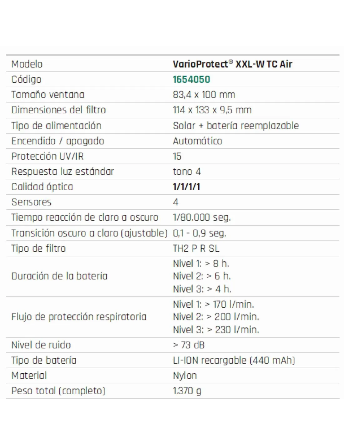 Duración de la bateria: Nivel 1: > 8 h. Nivel 2: > 6 h. Nivel 3: > 4 h.