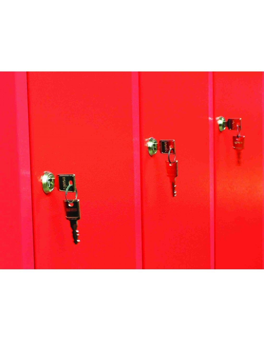 La taquilla de acero DEKLK2-3 de Metal Works dispone de cerradura en cada una de las 2 puertas y rejilla de ventilación. Sus interiores se dividen mediante un estante (600x500x1.800mm) situado en la parte superior. El exterior está recubierto por pintura martelé lacada.