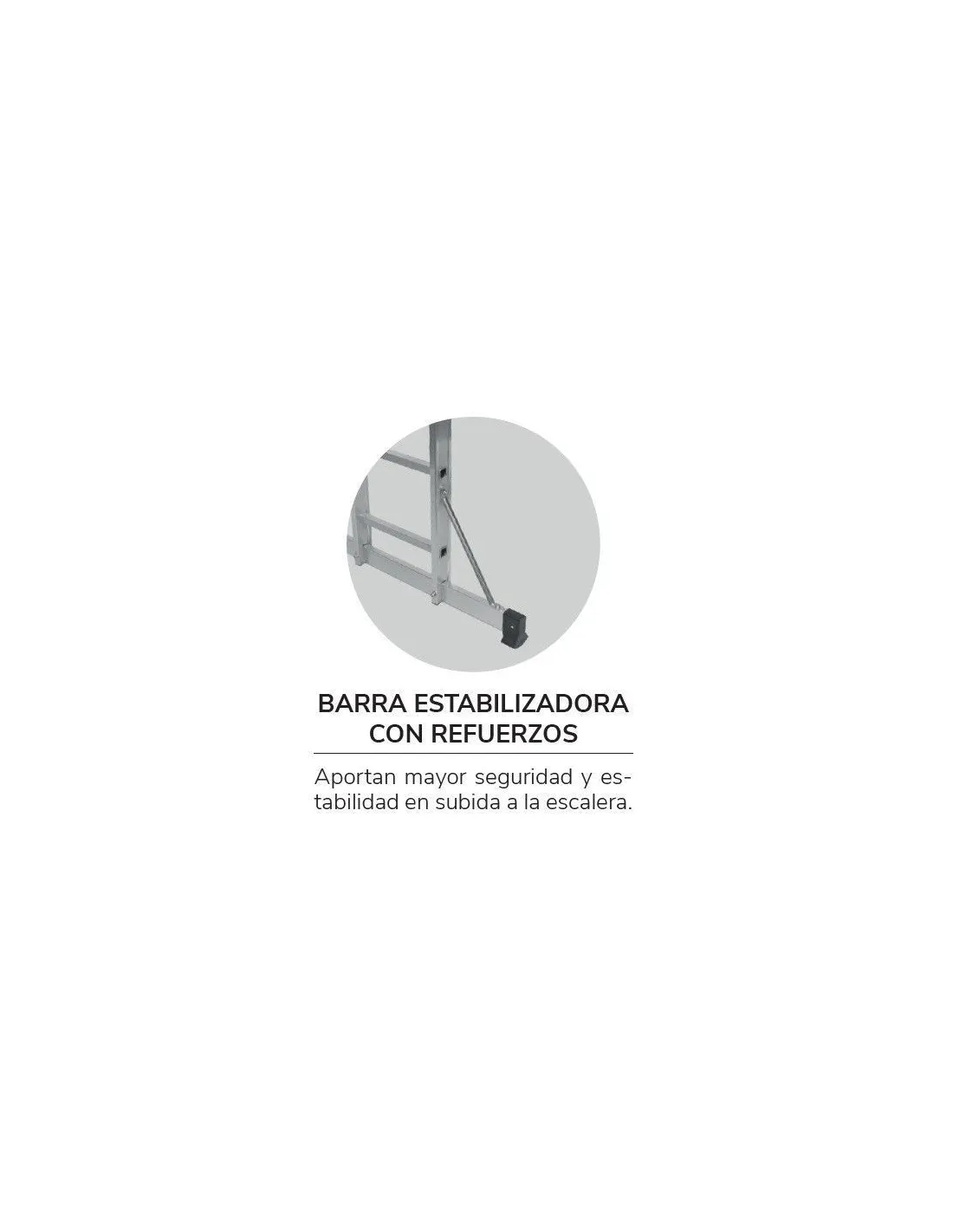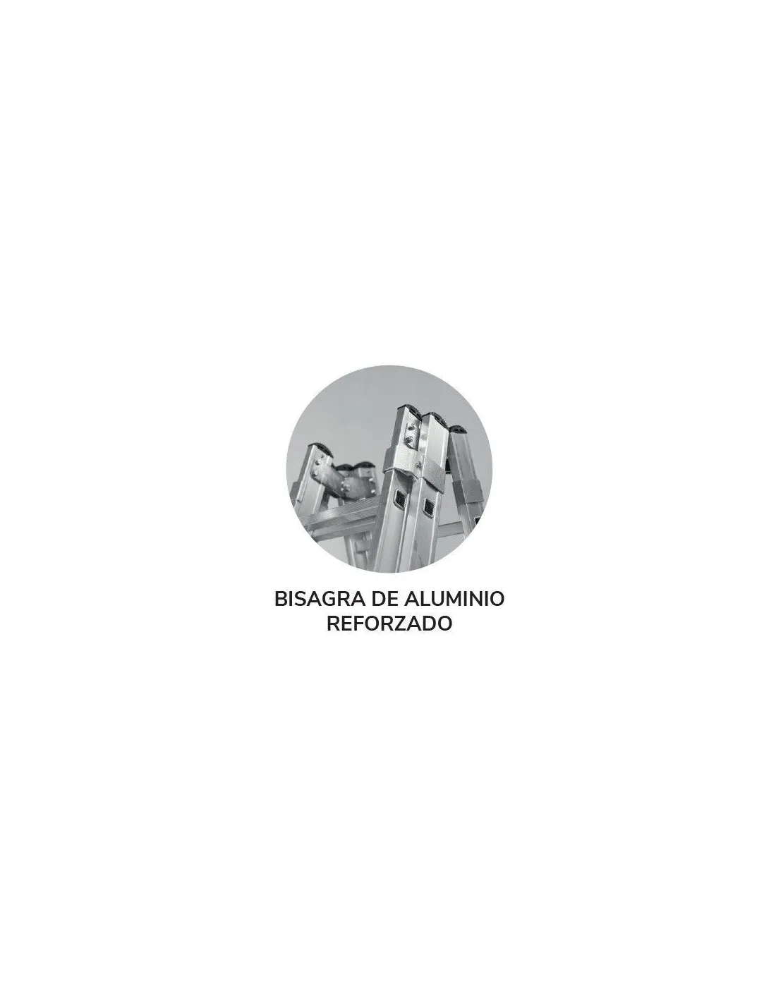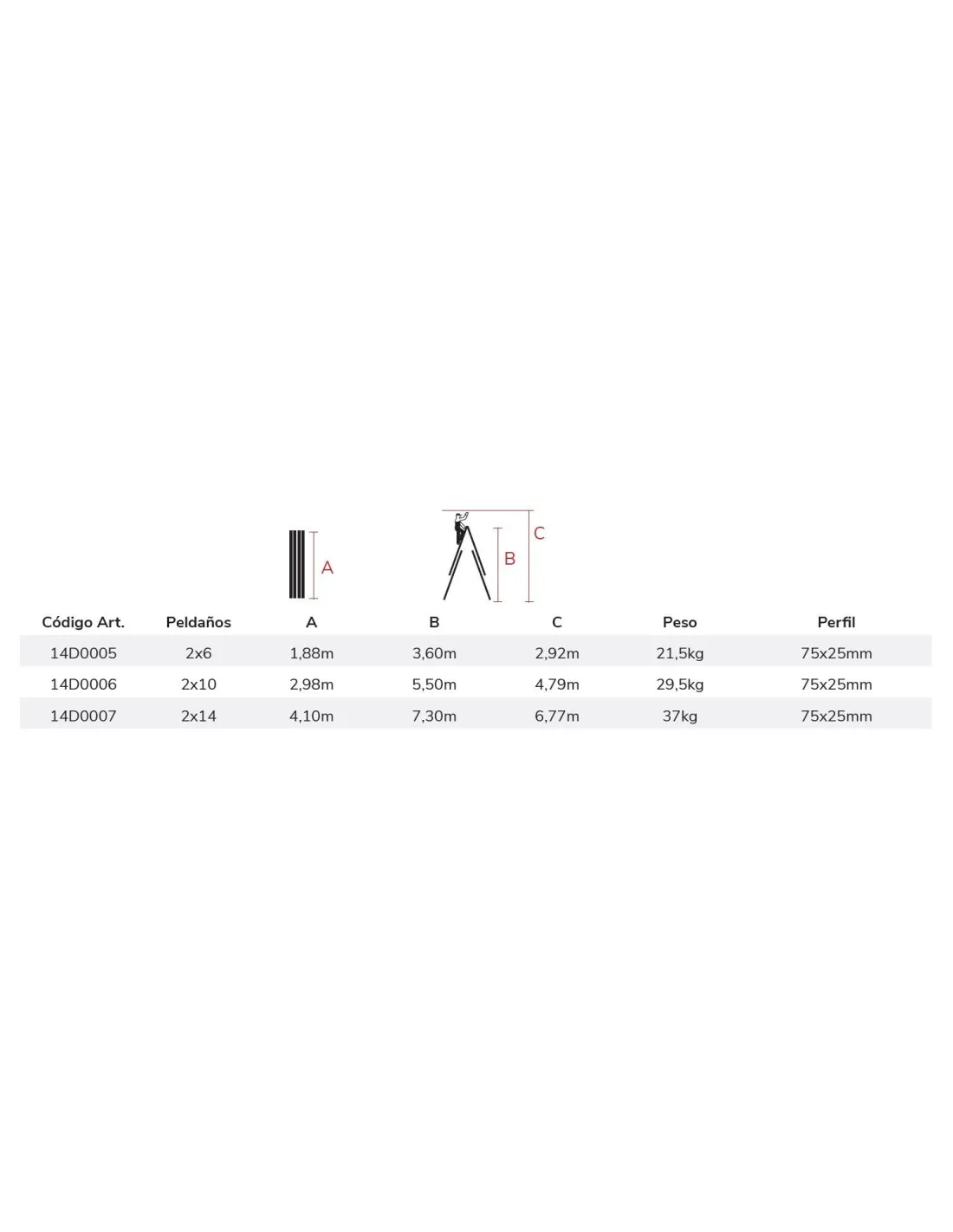 Escalera profesional de aluminio T6 extrusionado (máxima dureza) de dos elementos. Puede utilizarse en desniveles. Amplia base estabilizadora de 103cm. Perfiles laterales de 75x25mm con 1,3mm de espesor. Peldaños de 30x30mm. Dotada de pletina metálica de seguridad.
