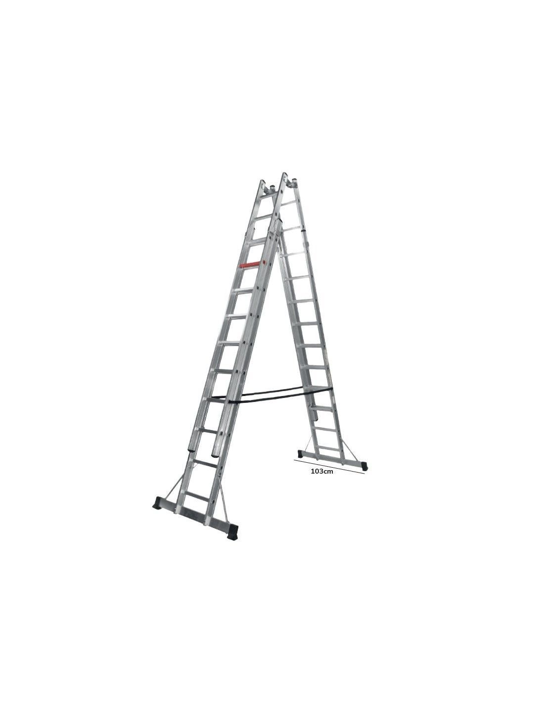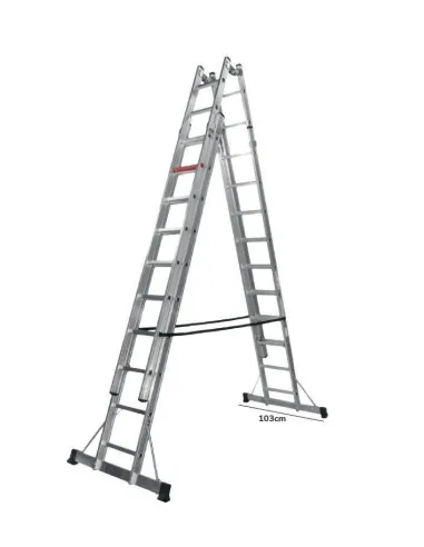 Escalera profesional de aluminio T6 extrusionado (máxima dureza) de dos elementos. Puede utilizarse en desniveles. Amplia base estabilizadora de 103cm. Perfiles laterales de 75x25mm con 1,3mm de espesor. Peldaños de 30x30mm. Dotada de pletina metálica de seguridad.