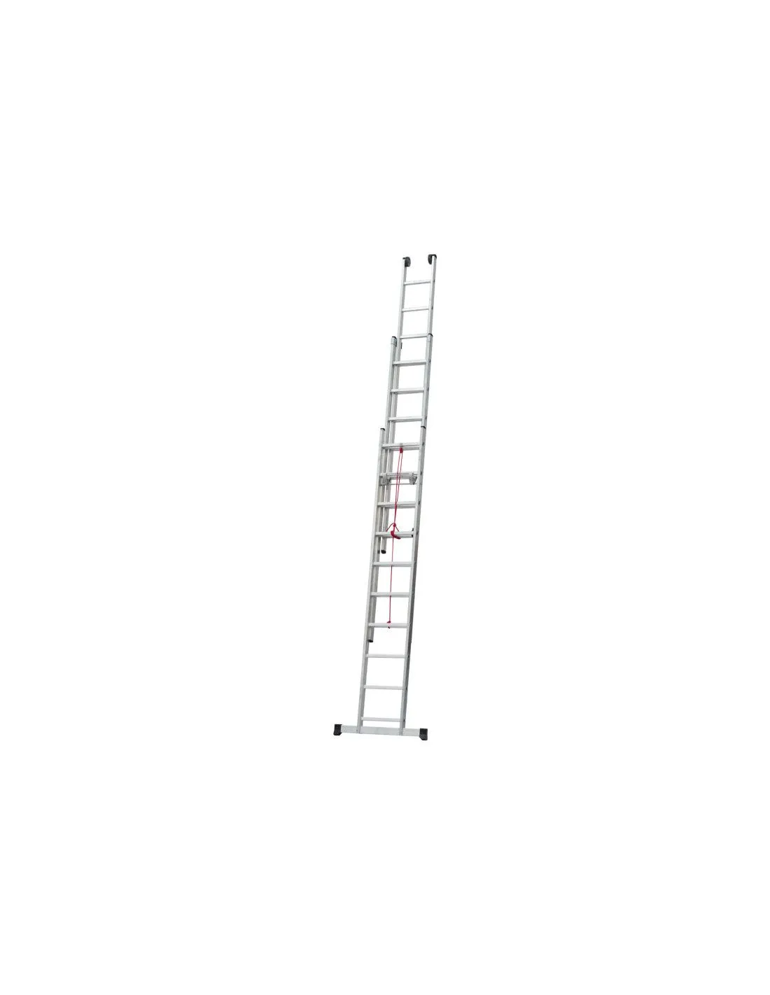 Escalera industrial profesional de alta gama con cuerda triple (3 tramos). Su innovador sistema sin bisagras, evita lesiones en su uso. Fabricada en aluminio nervado (para otorgar máxima resistencia). Mecanismo de cuerda y ruedas que facilita la apertura de la escalera. Ancho interior de 300 mm. Cómodo peldaño antideslizante de 30x30 mm. tacos antideslizantes y base estabilizadora.