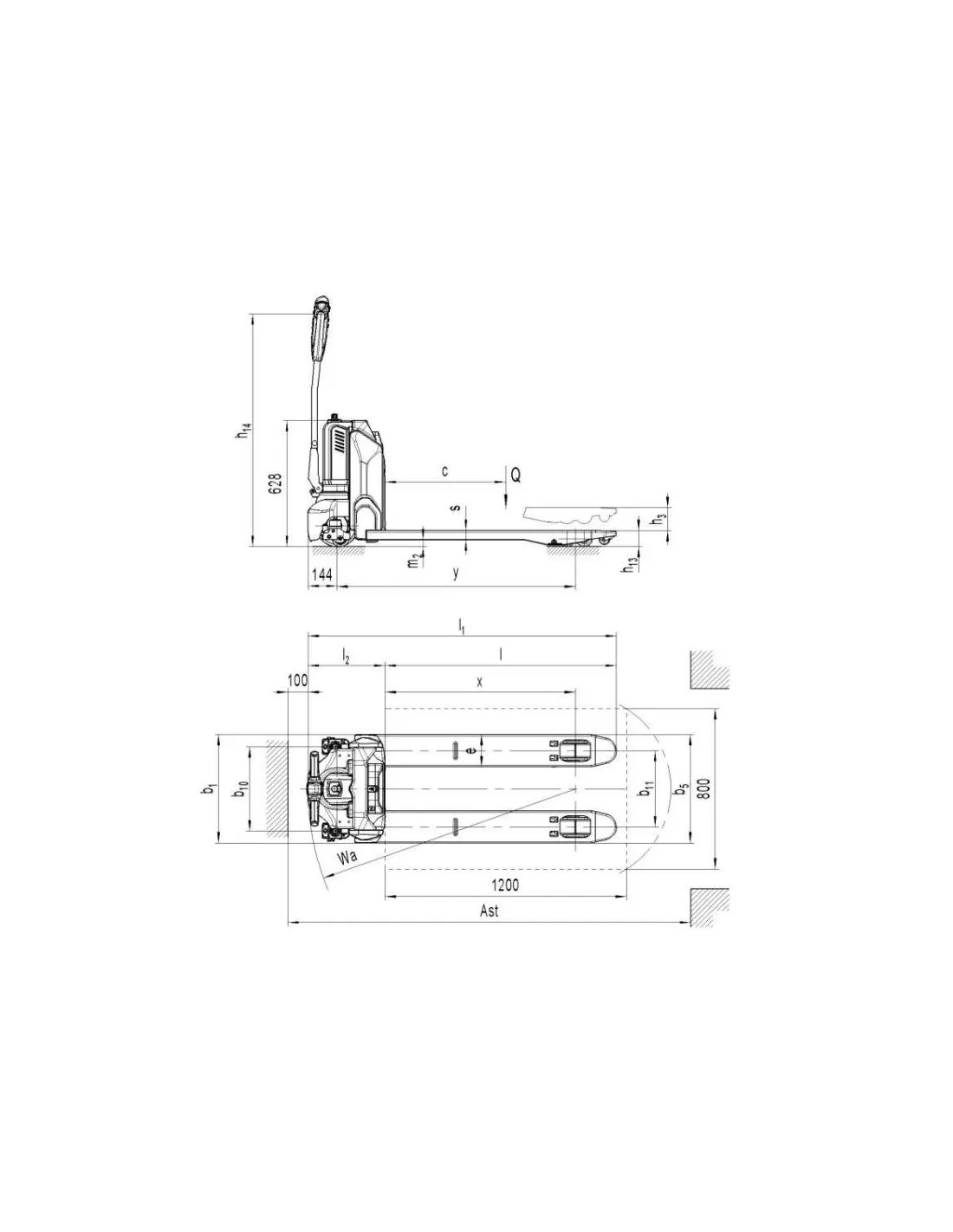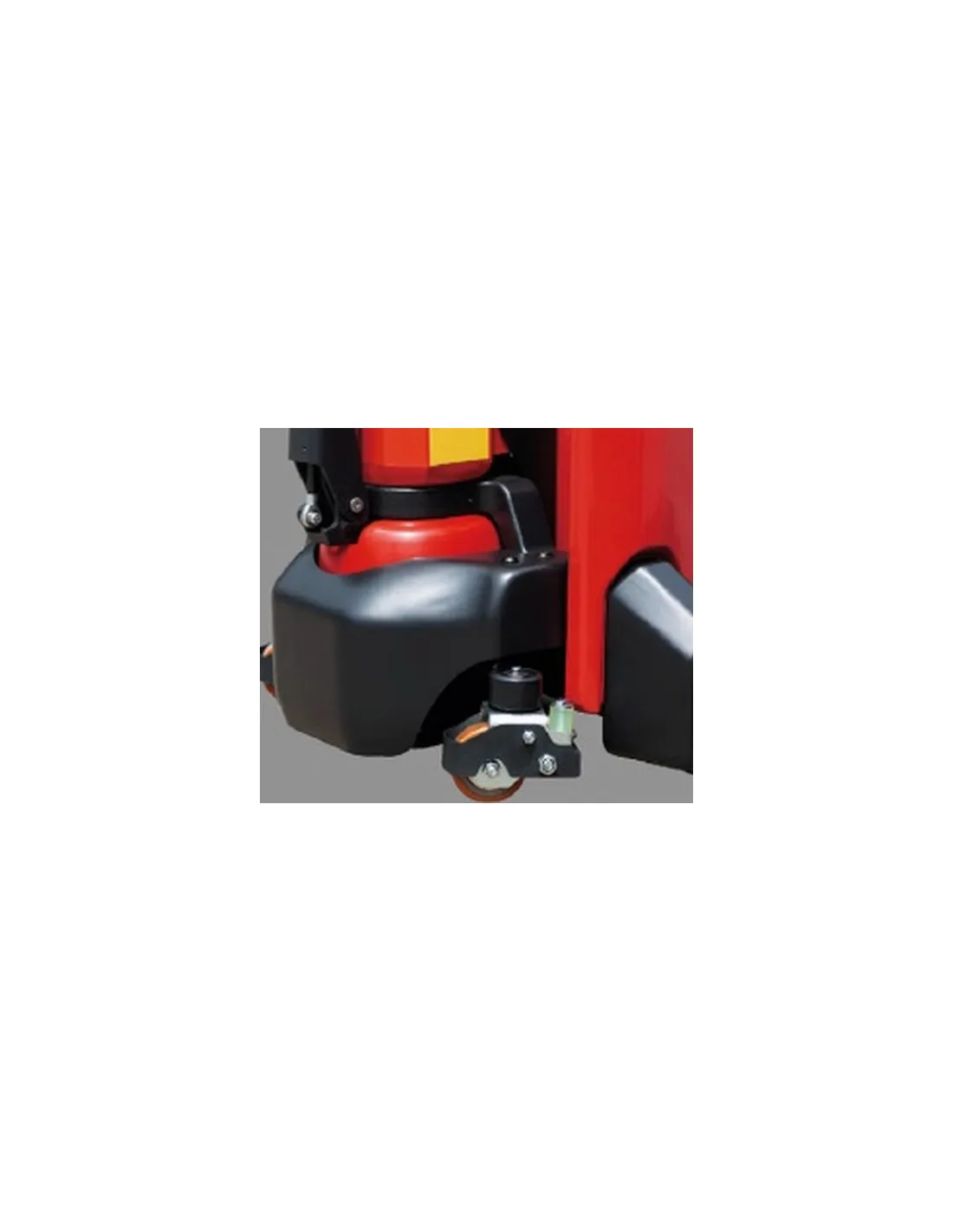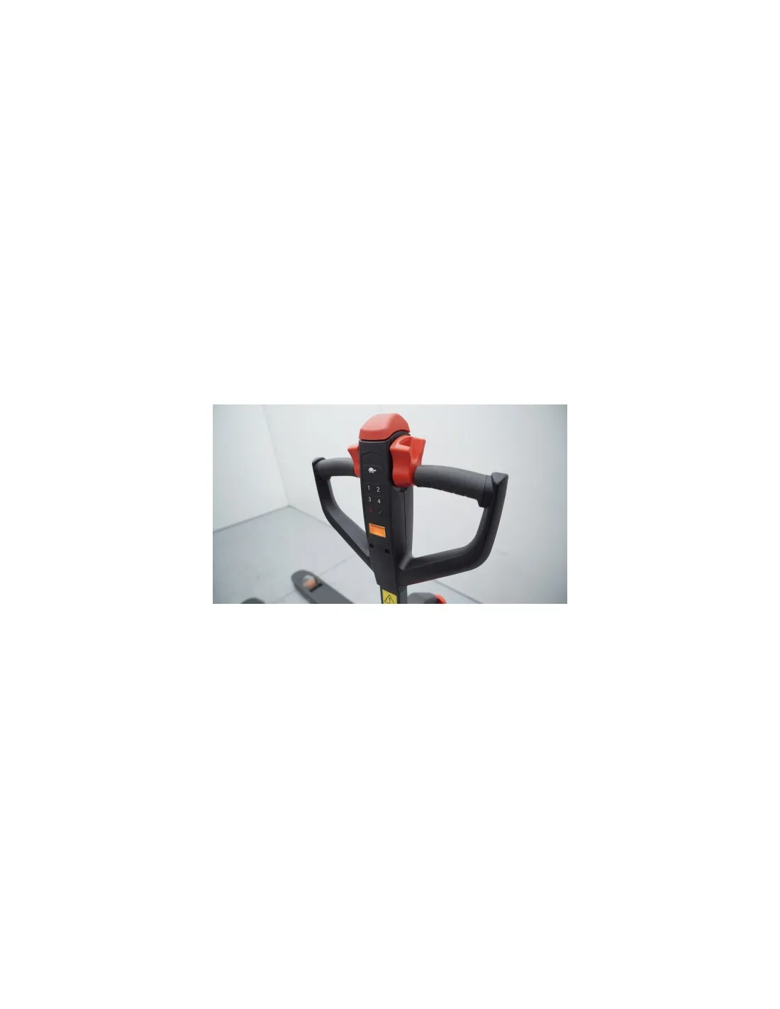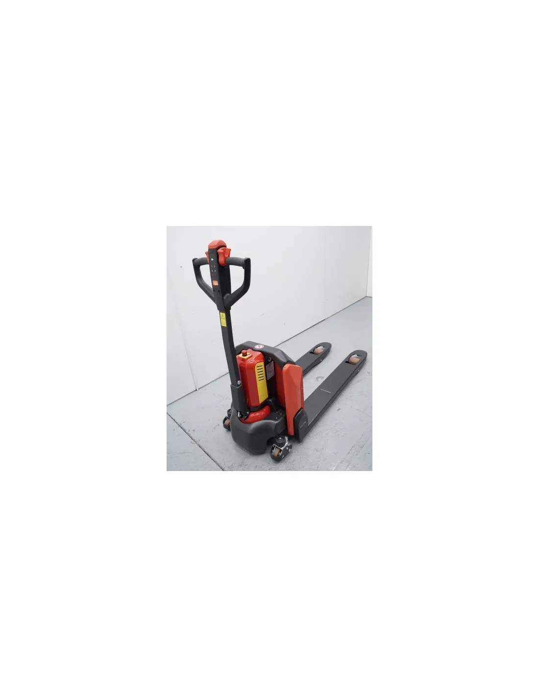 Traspaleta de elevación y traslación electrónica desarrollada para tareas de almacén y logística. Está pensada para transportar y elevar cargas de hasta 1500 Kg en espacios medianos/pequeños. Dispone de un timón de maniobra allí tiene los botones para su funcionamiento