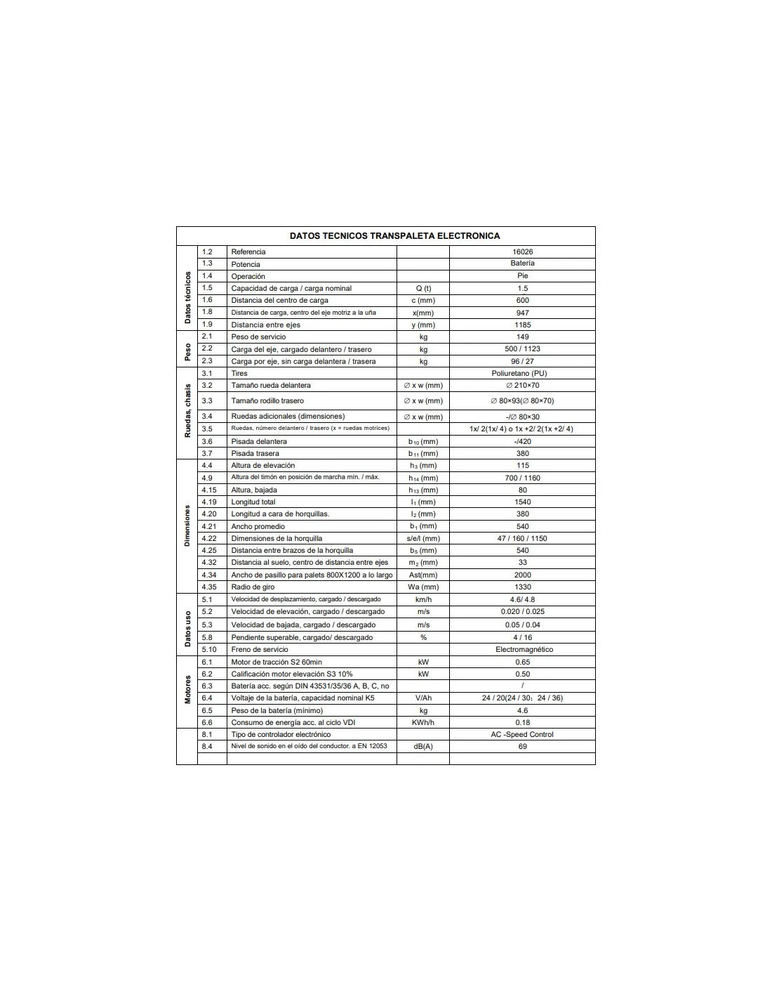 CARACTERÍSTICAS DE TRANSPALETA ELÉCTRICA MADER 24V 1.5 T