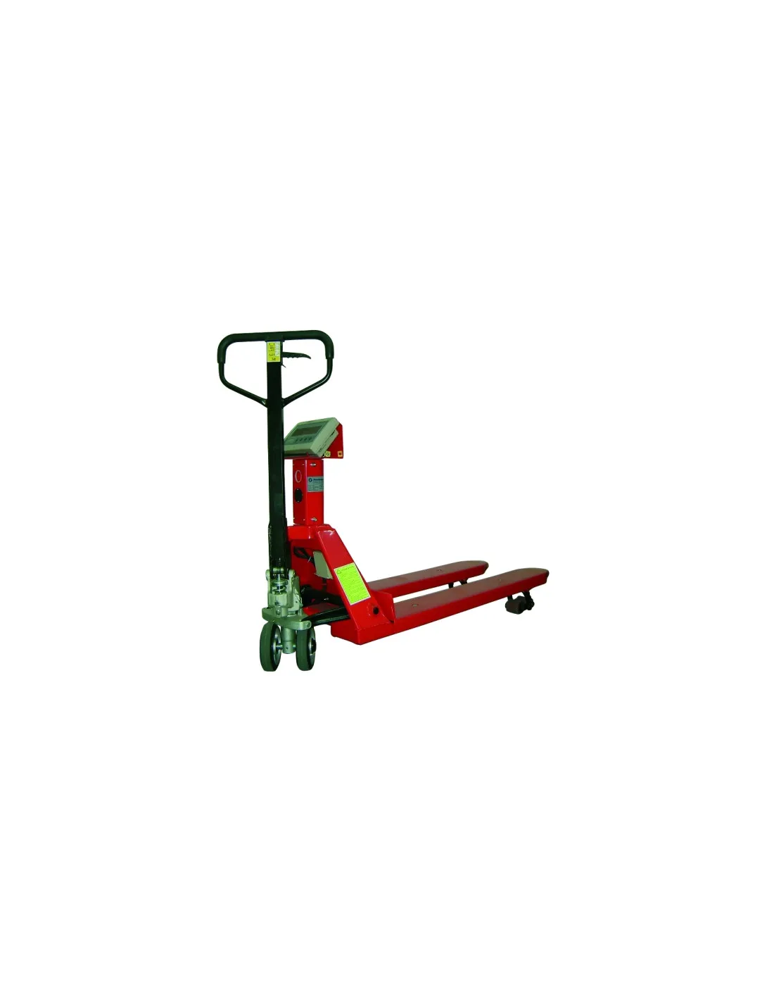 Transpaleta pesadora totalmente autónoma utilizable como transpaleta pero con indicación digital de peso, con pulsadores de tara y puesta a cero con protección IP55. Válvula de sobrecarga. Horquillas reforzadas. Rango del pesado de 0 a 2.000Kg aumentando o disminuyendo de 0,2Kg en 0,2 Kg. Exactitud báscula 0,1%.